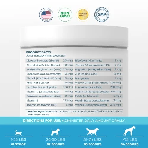 - Joint Supplement for Dogs and Cats – Our natural cat and dog supplement has Glucosamine, MSM, and Chondroitin which helps support joints and cartilage which increases your pet’s mobility.