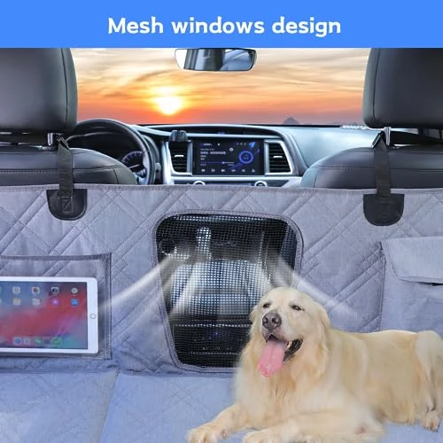 - 2.【Multiple pockets & Mesh windows】Backseat cover for dogs in car designed multiple pockets for you to store kettle, iPad & dog food etc. Car dog seat cover mesh windows ensures your dog feels cool in the heat by allowing for fresh air circulation. Your pet will be more secure and clam during the ride if you keep them in your line of sight.
