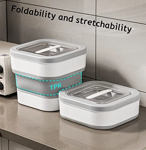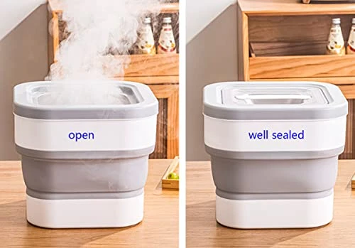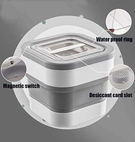 - 【Intimate Design】The Collapsible dog food storage container is designed with a large opening, which allows you to easily pick up and place ingredients; there are four magnetic switches and rubber rings on the lid of the food storage container, which can play a sealing role, waterproof and moisture-proof; with a measuring cup, which is convenient for scooping Appropriate amount of ingredients. There is a hole on the cover, you can put desiccant, spices, etc., it can be stored for a longer time!