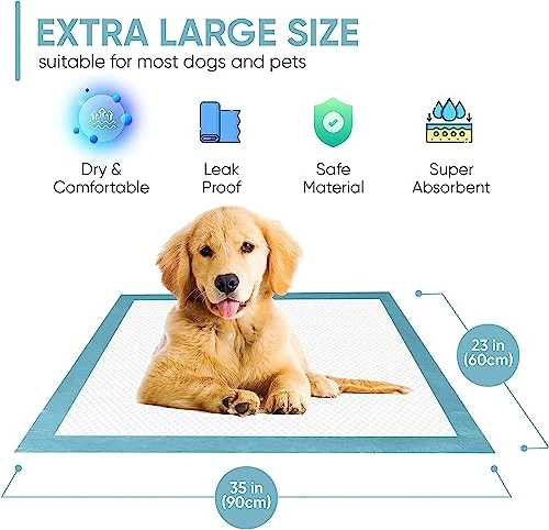 - 【EXTRA-LARGE SIZE】 Our wee wee pads come in an extra-large size (24 inch * 35 inch) suitable for all size dogs for pet potty training, aging pet assist, travel carrier, puppy tray, on car, covering water/food bowl spillage.