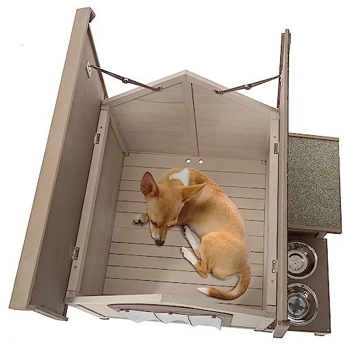 - 🐶【MULTIFUNCTION】- There is also add feeding area with two stainless steel feeding bowls to protect your dog’s spine and allow them to eat comfortably at a suitable height.This Wood dog house is ideal for backyard, patio, deck, etc.