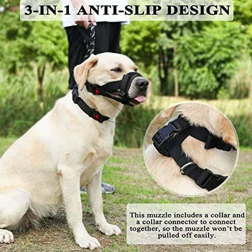 - 3-IN-1 Anti-slip Design: Why choose us? This soft muzzle for dogs comes with a dog collar and a connector to match. You don’t have to bother how to connect the muzzle to a collar anymore. The dog mouth guard connecting with a collar will make it hard to fall off.