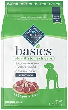 - Contains one (1) 4lb bag of BLUE Basics Skin & Stomach Care, Grain Free Natural Adult Dry Dog Food, Salmon & Potato