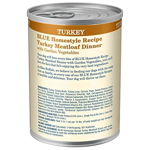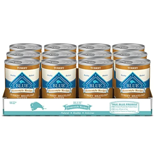 - Contains twelve (12) 12.5-oz cans of BLUE Homestyle Recipe Natural Adult Wet Dog Food, Turkey Meatloaf