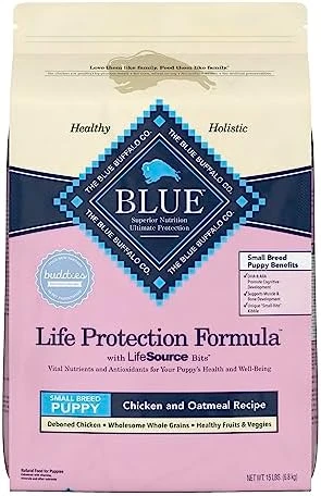 - Contains one (1) 5 lb. Bag of BLUE Life Protection Formula Small Breed Puppy Dry Dog Food, Chicken and Oatmeal