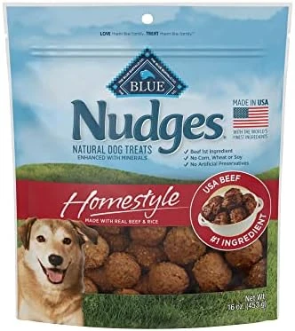 - PACKAGING MAY VARY: Contains one (1) 16oz bag of BLUE Nudges Homestyle Natural Dog Treats, Chicken