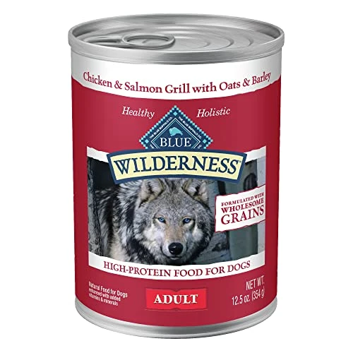 - Contains twelve (12) 12.5-oz cans of BLUE Wilderness High Protein Natural Adult Wet Dog Food plus Wholesome Grains, Salmon & Chicken Grill