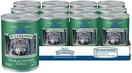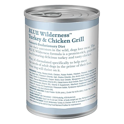 - Contains twelve (12) 12.5-oz cans of BLUE Wilderness High Protein Grain Free, Natural Adult Wet Dog Food, Turkey & Chicken Grill
