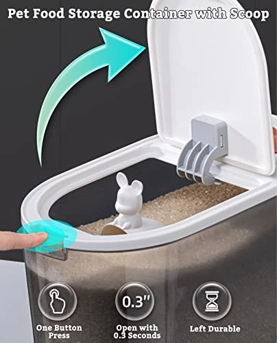 - 🐾【Intimate Design】The dry cat food storage with a shape of cartoon mouse measuring cup and one-touch lid opening, Spring loaded cover for easy access. Only one touch is needed to safely open or close the food container.
