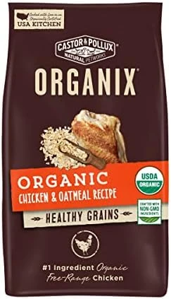 - USDA organic certified dry dog food with grain that is made with organic chicken raised without any added growth hormones or antibiotics