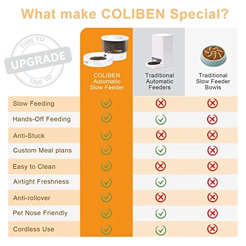 - Schedule Feeding Plan: With COLIBEN cat slow feeder, you can set 1-10 meals per day and up to 99 portions per meal to customize a healthy diet for your pets. No more pre-dawn wake-up calls, or excessive worries when overtime at night and travel. Our automatic cat feeder will dispense food with right portions at right time!