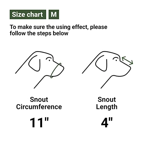 - PLEASE MEASURE: circumference (value A on the second photo) and length (value B on the second photo) of your dog’s snout to confirm size. Size M: A is 11″. B is 4″. Size L: A is 13″. B is 4″.
