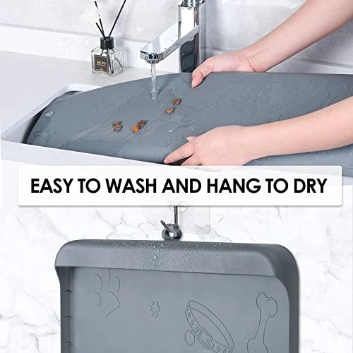 - 【Easy to Clean and Store】- The dog cat bowl mat can be easily cleaned by rinsing, also simply wipe the mat with a damp cloth to dry quickly. The built-in hanging holes can be hung to dry. Plus, the flexible silicone material allows you to roll pet mat up and easily store dog mat in a drawer when not in use.
