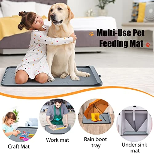 - 【Right Size for All Kinds of Dogs and Cats】- Our large dog mat for food and water measuring 36 x 24 inches, thick 0.2 inches edge for maximum dog bite resistance. Also, the edge lip raised to 0.75 inches which is higher than the average mat. No more messy spills on your floor and carpets. It fits most pets and is a great choice for dogs or cats or any animals.