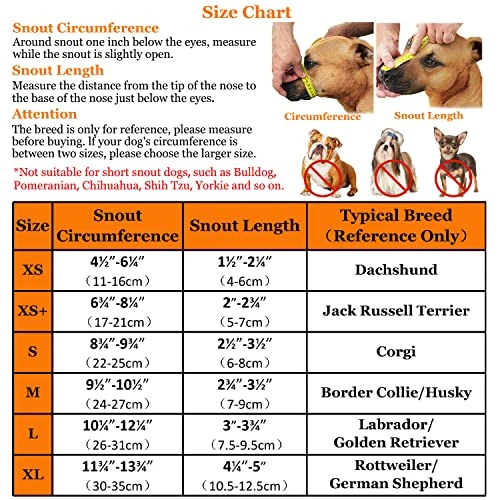 - Multiple Size Options-This pet muzzle is available in 6 sizes. The small dog muzzle is suitable for Dachshund, Jack Russell Terrier and so on. The medium sized dog muzzle is suitable for Border Collie, Husky and so on. The large dog muzzle is suitable for Labrador, Golden Retriever and German Shepherd and so on. But this dog muzzle is not suitable for flat-faced dogs such as Pit Bull and Boxer.