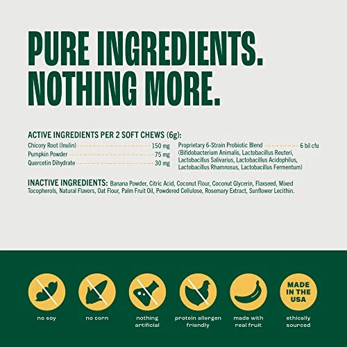 - Support Proper Bowl Health – These pre and probiotic chews for dogs include Quercetin to help enhance intestinal barrier function, and tasty Pumpkin to ease occasional gastric distress (diarrhea, gas, or constipation) in any breed, small or large