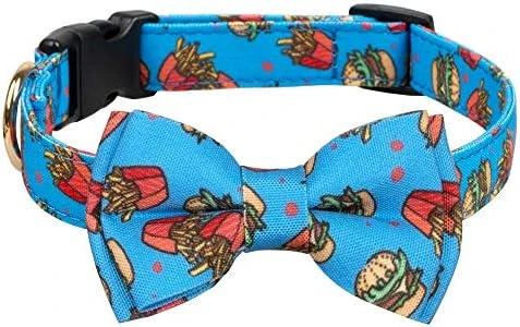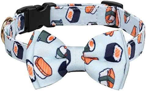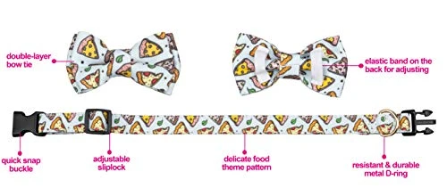 - DESIGN: The collar is designed with pretty cartoon delicious food patterns: sushi, hamburg, donut, pizza. The bowtie is movable and detachable, so there are two metohds of wear. This series of patternds are cute and fun, ideal for outdoor look in daily and kinds of special days. Good gift for your love dog