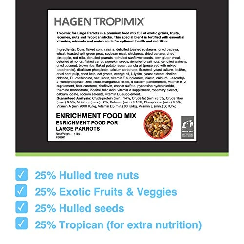 - Helps with Diet: Tropimix helps transition parrots hooked on certain seeds like sunflower to a varied diet which includes more legumes and formulated pellets like Tropican. All ingredients are 100% edible and can be served dry or moistened.