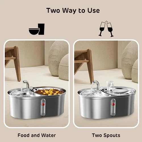- Pet Fountain with Two Spouts – You can convert the food bowl into the second water bowl. Suitable for multiple pets family, as it features two spouts and two distinct water trays that enable cats to drink from both sides.