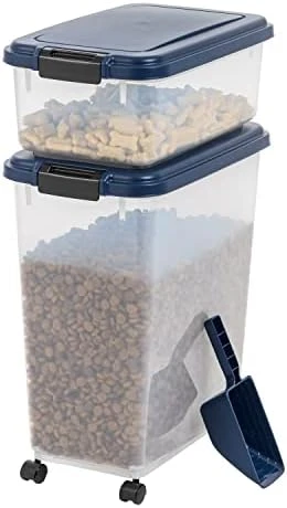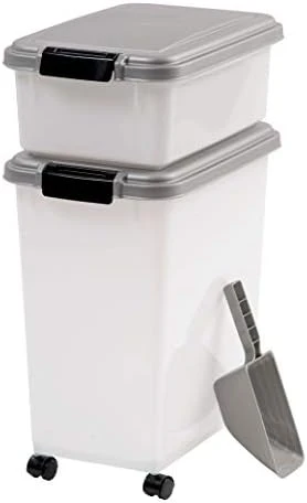 - CONTENTS: 12 Lbs / 14.8 Qt storage container stacks on the 30 Lbs / 42.7 Qt storage container, one matching 2-cup food scoop, and one set of wheels. Included scoop makes measuring food easy and attachable casters make it easy to roll it from the storage area to your dog or cat bowl.