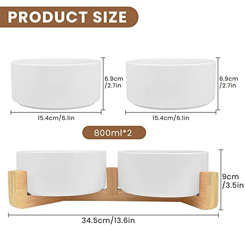- Anti-slip and Anti-tip: The 850ml large capacity cat/dog bowl can hold more food and water for cats and dogs to eat. The wooden stand base is anti-skid, stable and not easy to be overturned.