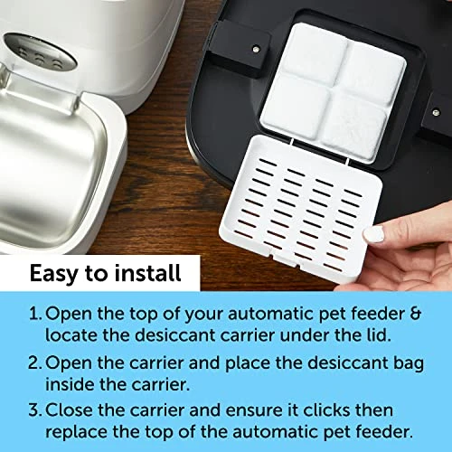 - Easy to Install – Open the top of your feeder to locate the desiccant carrier under the lid. Open the carrier lid, place the desiccant bag inside, close it, and ensure it clicks shut. Replace the top of the automatic pet feeder and repeat every 2 weeks