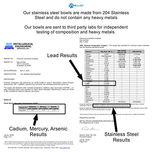 - QUALITY STAINLESS STEEL: Our dog bowls are made from high quality 204 thick stainless steel. They are thicker and heavier than other bowls. The small bowl weighs 9 oz, the medium bowl weighs 16 oz and the large bowl weighs 1.2 lbs. Our bowls are independently lab tested and free of heavy metals.