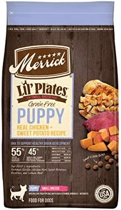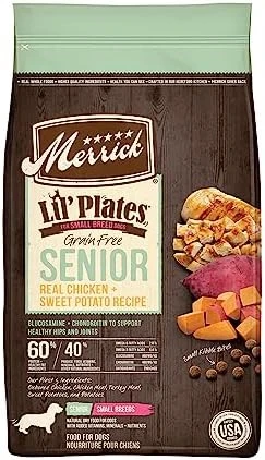 - This senior dog food from Merrick Lil Plates dog food for small dogs features L-Carnitine to support healthy senior metabolism
