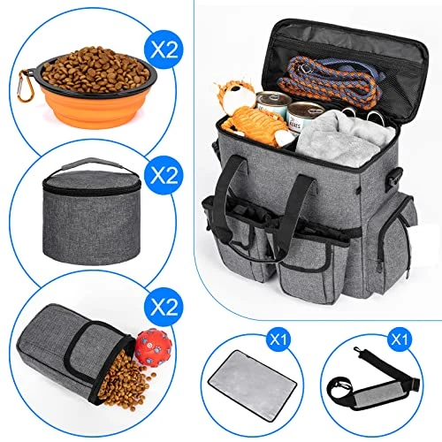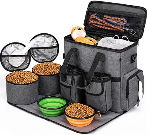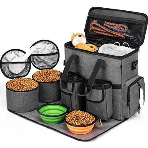 - Excellent Material Dog Travel Bag for Supplies: sturdy construction from heavy stitch,top-quality zippers,and durable easy to clean water-resistant oxford outer material with PVC backing,and Leak-Proof inner lining.Bowls are made of Safe food grade high-quality silicone materials and are dishwasher safe.The perfect dog travel kit for dog lovers and an ideal dog diaper bag,dog mom bag and puppy travel bag for new dog moms and dads