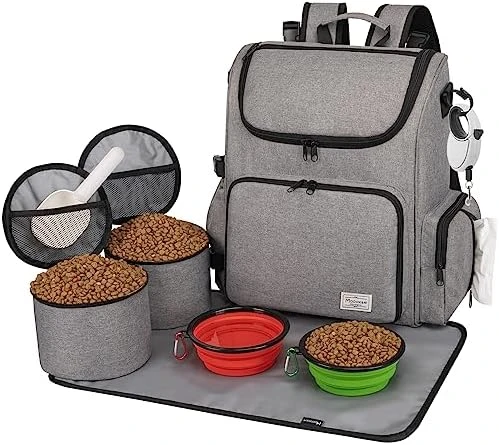 - Airline Approved Dog Travel Bag: dimensions is 16″(L)*11″(H)*8″(W), airline compliant and fit under seat.Our airline approved and carry-on compliant dog travel bag features a roller bag sleeve to fit over your luggage suitcase handle, making travel more convenient.Modoker dog travel bag set includes: 1*dog tote bag,1*detachable shoulder strap,2*dog treat training pouches,2*dog food carrier bags,1*water-resistant placemat, 2*pet silicone collapsible bowls