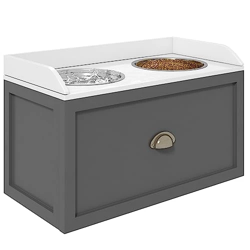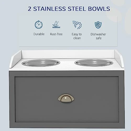 - Dog Food Stand Info: Suitable for large dogs with shoulders measuring 19.75″- 23.5″. Overall Dimensions: 23.5″ W x 11.75″ D x 14.25″ H. Weight Capacity: 33 lbs. (Drawer, Top). Assembly Required. Bowl Capacity: 2L. Bowl Size: 9.5″ Dia. x 2.75″ H.