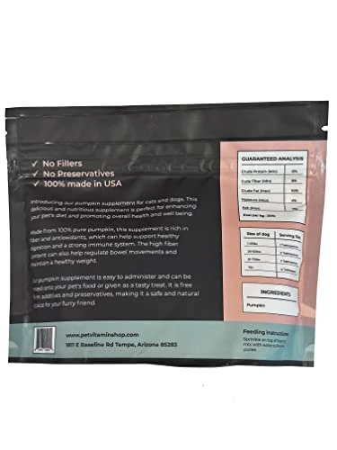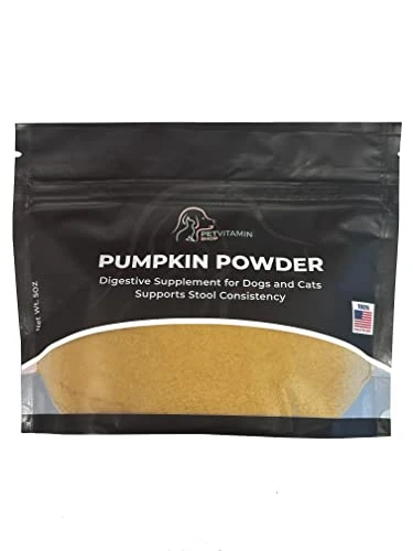 - Digestive health: Pumpkin powder can help promote healthy digestion in dogs and cats. The high fiber content helps regulate bowel movements and can alleviate diarrhea, constipation, and other digestive issues.