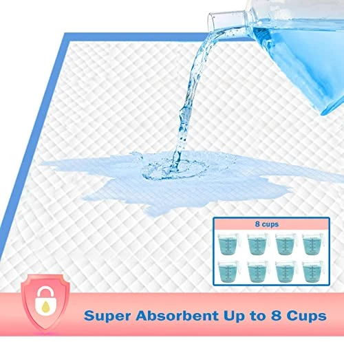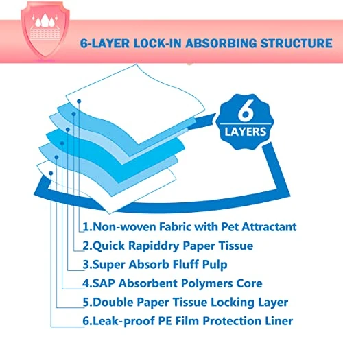 - 🐾【Super Absorbent & Quick Drying Puppy Pee Pads】The dog potty training pad is more absorbent than other products and holds up to 8cups of pet urine. The built-in fresh scent attracts, Unique flash-dry technology quickly turns liquids into gels, preventing tracking, liquid spills and unpleasant odors.