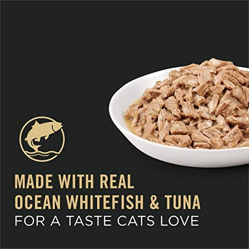 - Adult cat food with sauce made with real ocean whitefish and tuna for a taste cats love and no artificial colors or preservatives