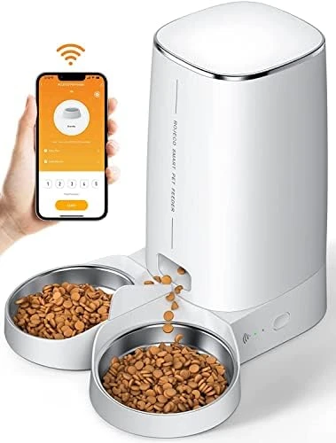 - 😸【Keep Your Pet Healthy】The parts and stainless-steel feeding bowl of this cat feeder automatic are detachable for thorough cleaning. Built-in desiccant bag with a sealing cover keep food fresh. All we want is to provide your pet a cleaner and healthier living! ROJECO cares and loves your puppy.