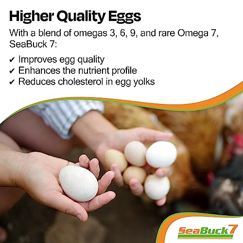 - HIGHER QUALITY EGGS – SeaBuck improves egg quality, increases egg yolk Omega 7 from 1mg to 60mg, and reduces cholesterol in egg yolks. With a blend of omegas 3, 6, 9, and rare omega 7, it maximizes nutritional value, leading to delicious and nutritious poultry that keeps customers satisfied.