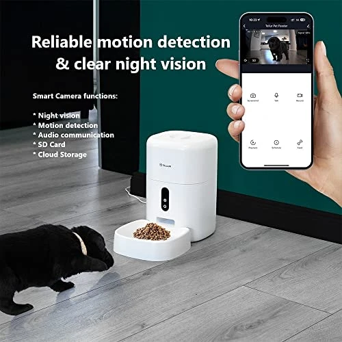 - ALL OPTIONS – TELLUR SMART Auto Pet Feeder has a large capacity of 4 liters and can hold almost 2 kg of dry pet food at a time. Only compatible with dry foods with a particle diameter between 2mm and 12mm. Remotely set times, meals and portions to feed your pets via the Phone Smart app. The app also provides push notifications for low food level and feeding time, and a food logging log.