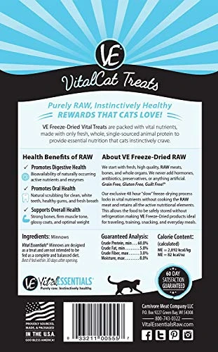 - LIMITED INGREDIENT TREAT: the purr-fect treat for your hungry feline! Prepared from pure, raw, Minnows, slow, freeze-drying process, no muss, no fuss!
