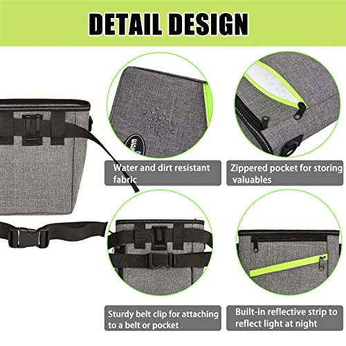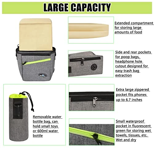 - 🐕【CONVENIENT DESIGH】: 1 main pocket to store snacks, dog food, toys, etc. 1 enlarged zipper pocket for cell phones up to 6.7 inches or keys, wallets, etc. 1 small waterproof zipper pocket for wet towels wet wipes, etc. There is a garbage bag storage pocket on the back side for easy extraction of garbage bags. Comes with a 600ML water bottle pouch for a water bottle and some snacks. d-ring to hang collapsible bowls and clickers to keep your hands free.