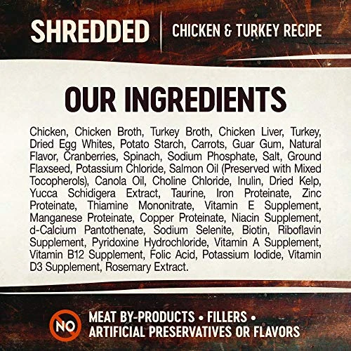 - SHREDDED CHICKEN & TURKEY: This natural, grain-free recipe features real chicken and turkey served with a savory, light gravy to satisfy even the most refined palate.