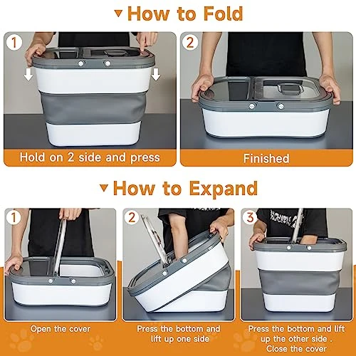 - 【EXTRA-LARGE & SPACE SAVER】】Extra-large food storage container ideal for storing many things. Unfolded size:17.7″L x 12.9″W x 13.9″H, it has a capacity of 25L (23Qt) and can store about 50 lbs of rice or 30 pounds of pet food; Folded size:17.7″L x 12.9″W x 5.51″H , it has a capacity of 6.5L (6Qt) and can store about 20 lbs of rice or 13 pounds of pet food.