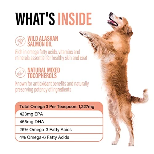 - 🦴 NUTRITIONAL SUPPORT FOR JOINT STRENGTH AND FLEXIBILITY: Pets specifically need EPA and DHA to help decrease inflammation. EPA and DHA is typically found in fish oil which is praised by veterinarians and pet nutritionists for helping build strong bones and maintain proper joint nutrition. Zoomi Pets Wild Alaskan Salmon Oil contains 1,227mg of omega 3, 423mg EPA, and 465mg DHA per teaspoon making it one of the most potent and best dog fish oil supplements on the market.