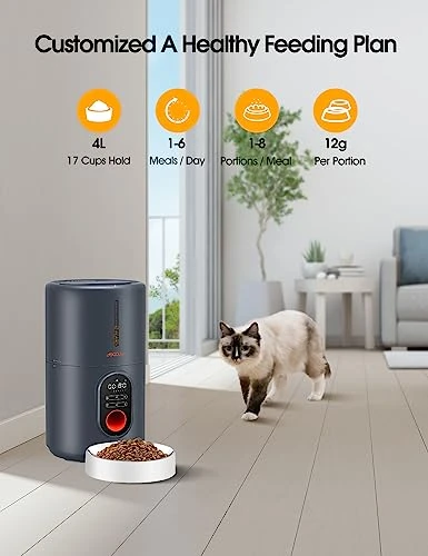 - 【Larger Capacity 】The 4L automatic pet feeder can hold up to 17 cups pet dry food, which can meet the feeding needs for your short trips for up to 20 days. For drying pet food with a diameter of 2-12mm (0.078-0.47in).
